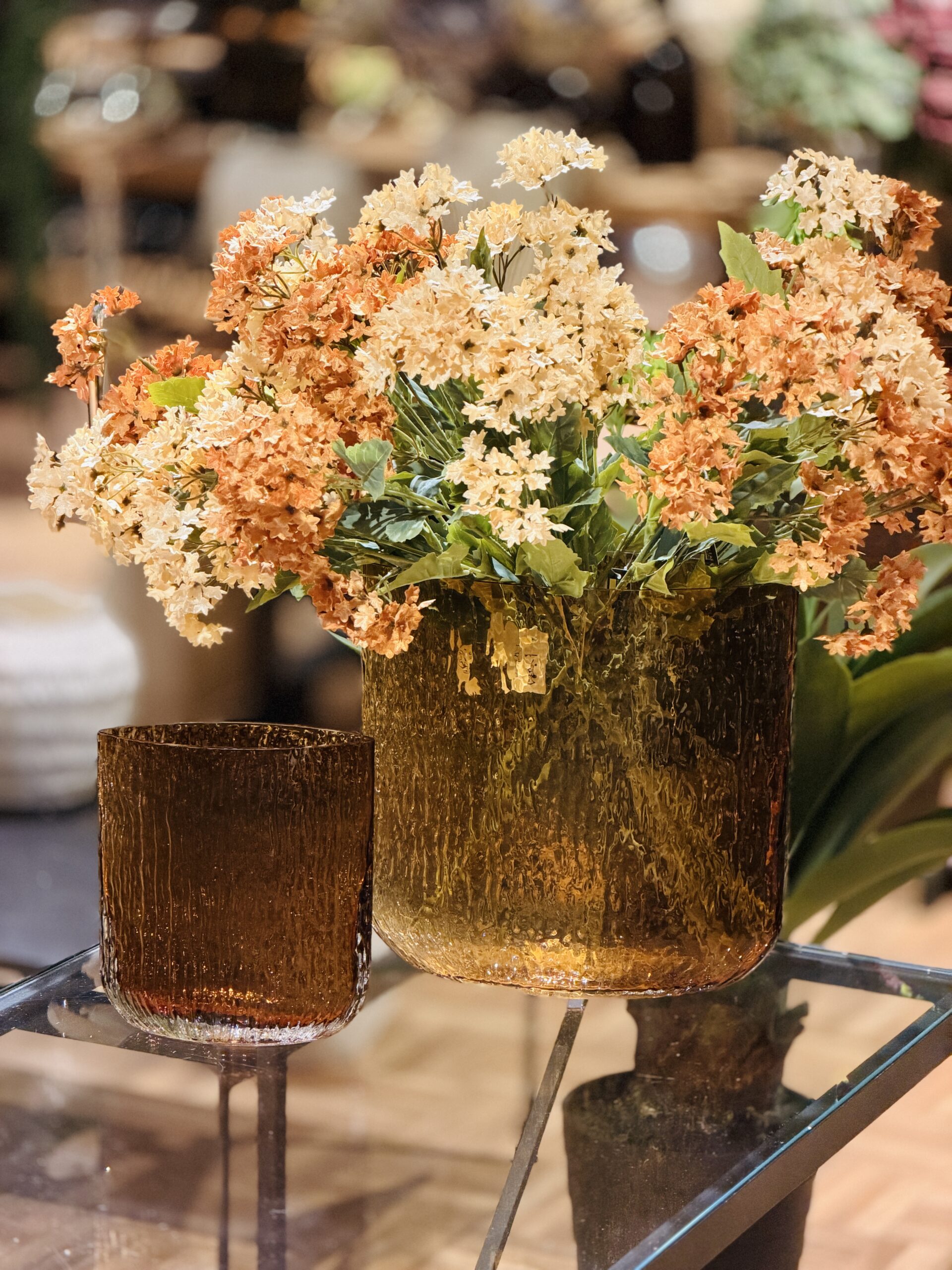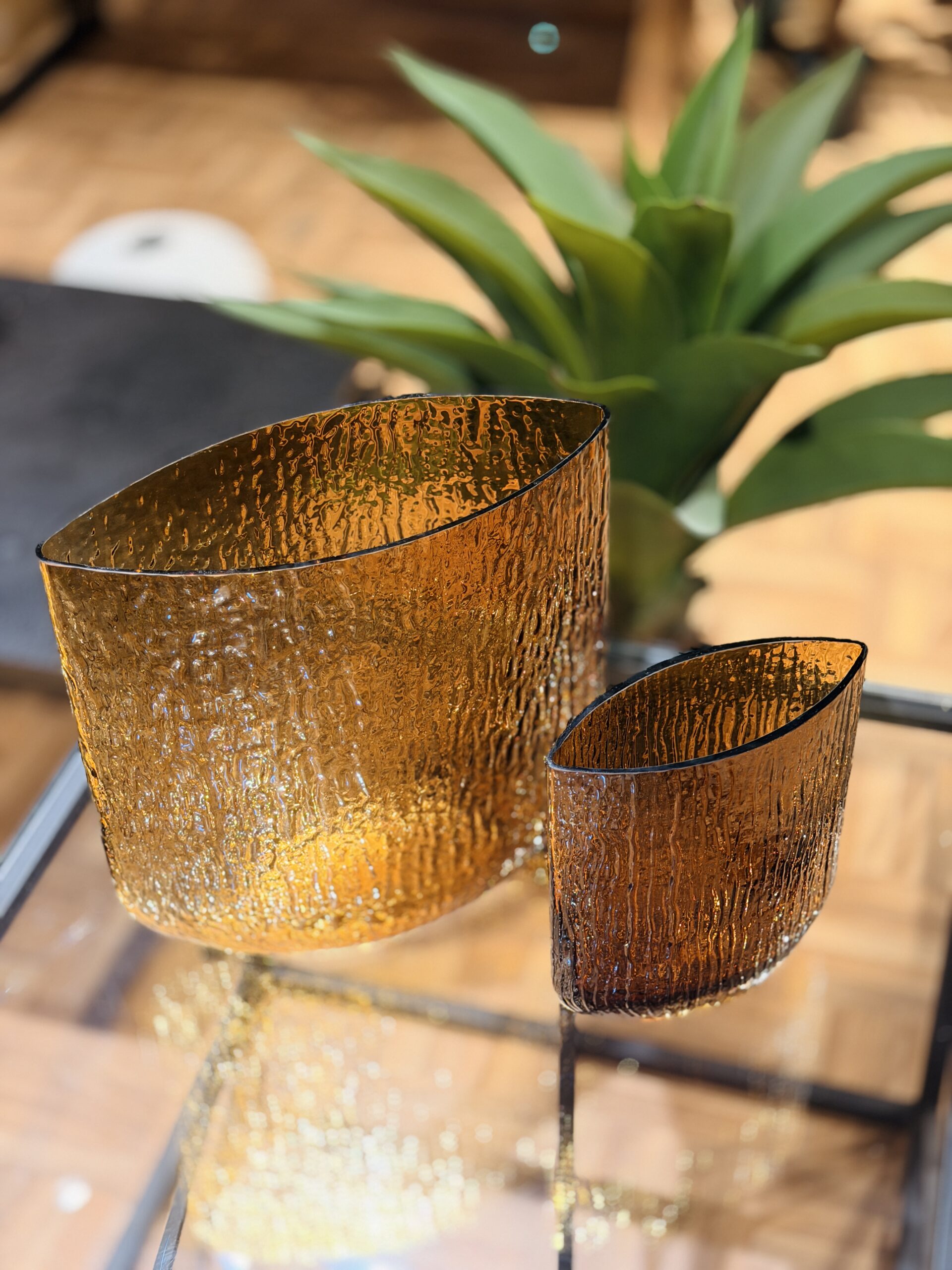אגרטלים מרשימים עשויים זכוכית מאסיבית בגימור מחוספס ובצורה פחוסה ייחודית, בגוון חום חם ואלגנטי.