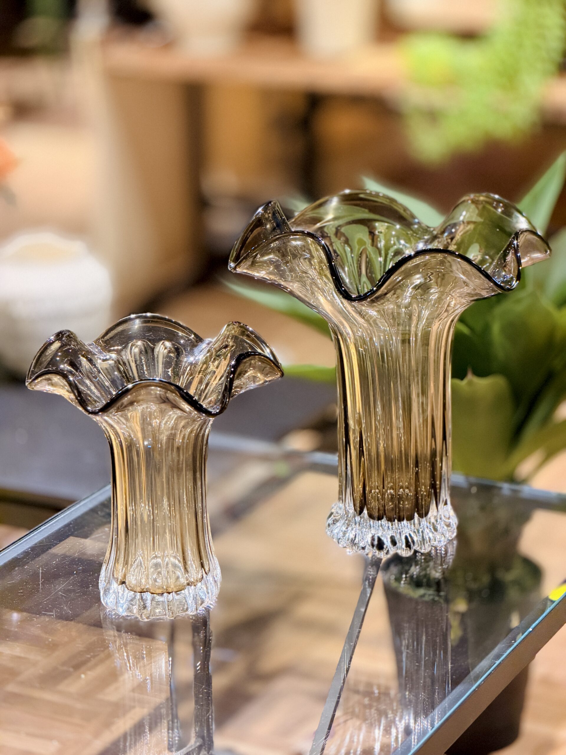 סט אגרטלים מרשים בעיצוב ייחודי ומאסיבי, עשוי זכוכית בגוון חום חם ובסגנון אירופאי אלגנטי.