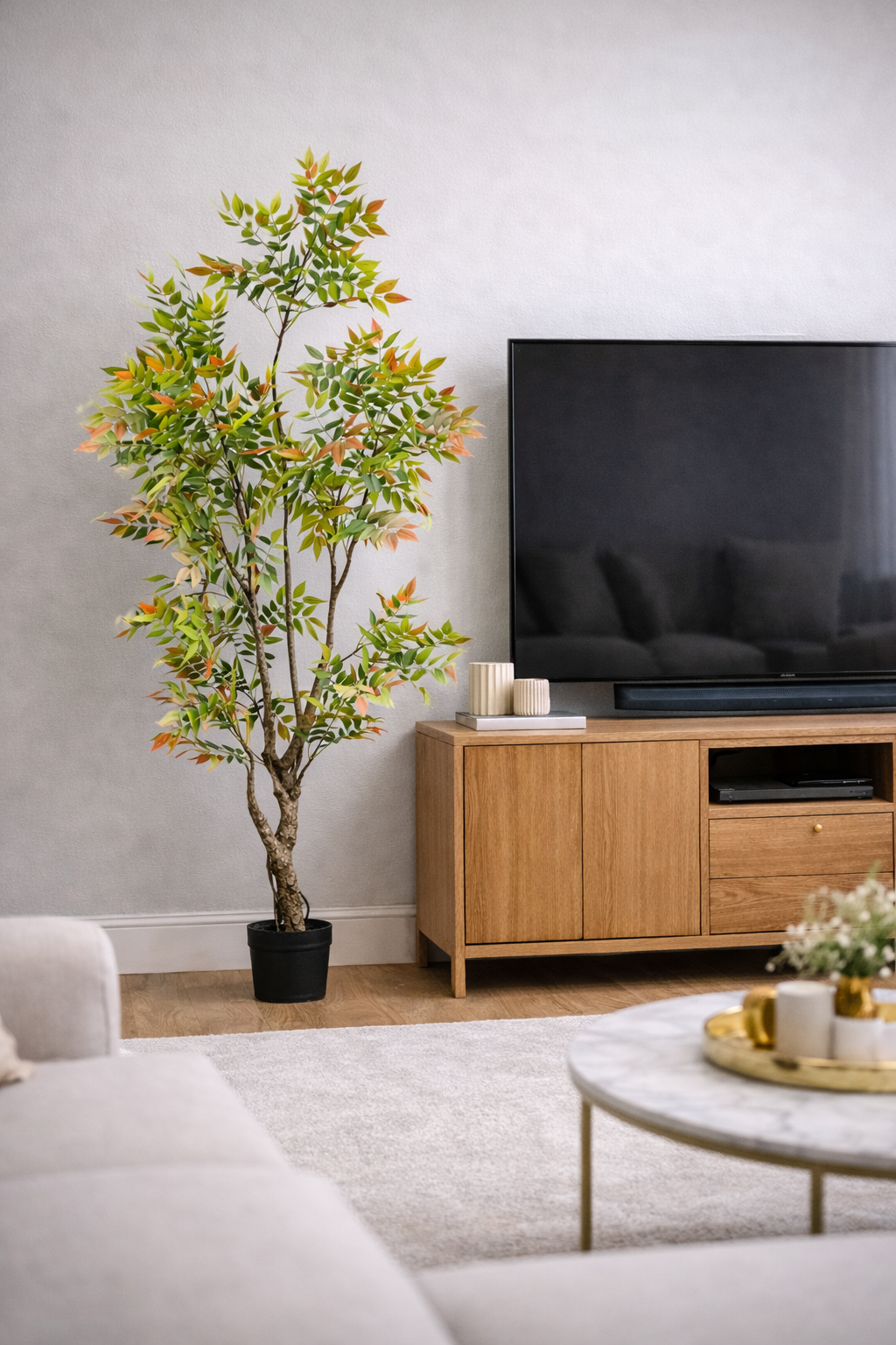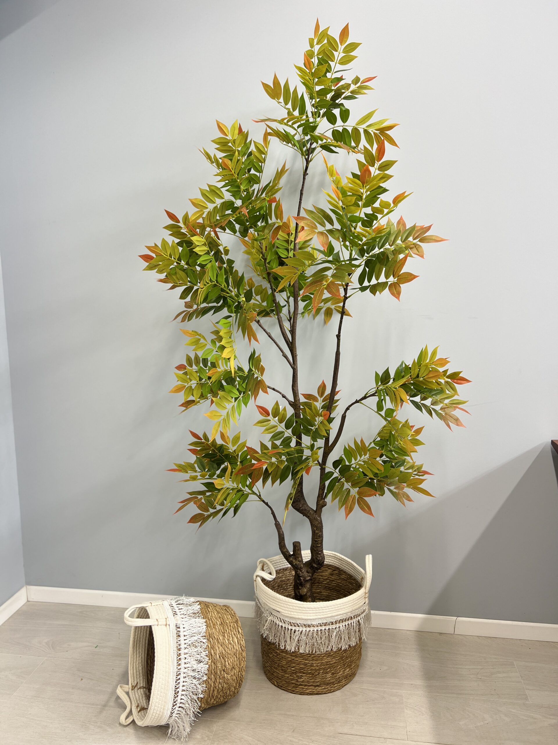עץ סומק מלאכותי במראה טבעי ועשיר, עם ענפים מעוצבים ועלים בגוונים ירוקים משולבים בנגיעות חומות ועדינות.